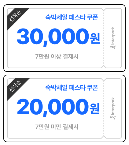 인터파크에서는 최대 3만 원 중복 & 즉시할인(카드사 중복 할인)되는 추가혜택이 있습니다. 쿠폰 다운로드 하셔서 추가혜택까지 챙겨 의미 있는 한가위 황금연휴 보내 보세요.