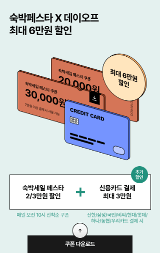 온라인 여행몰 "떠나요"에서는 지역 관광활성화에 보탬이 되고 국민 모두의 행복한 여행을 응원하며 대한민국 숙박세일페스타에 참여합니다. 쿠폰 다운로드 하셔서 조금이라도 숙박비 절감해 보세요.
