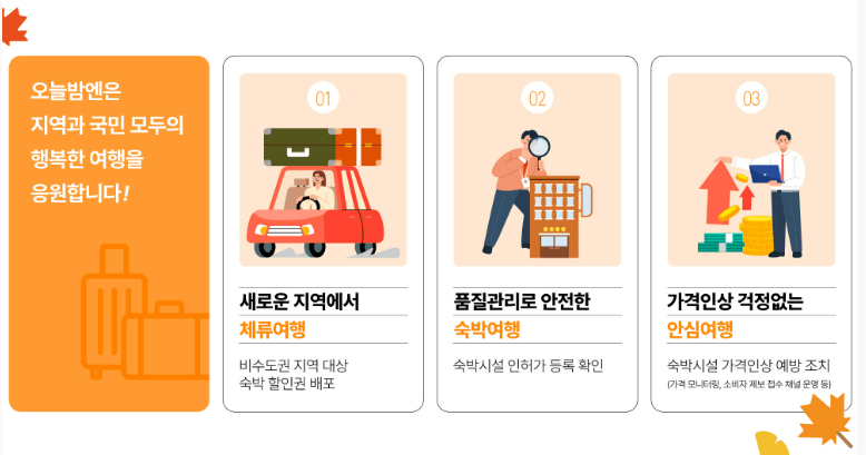 온라인 여행몰 "오늘밤엔"에서는 2024 대한민국 추석맞이 숙박세일페스타에 참여하여 지역과 국민 모두의 행복한 여행을 응원합니다. 2~3만 원 할인 쿠폰 발급받으셔서 즐거운 한가위 보내세요.