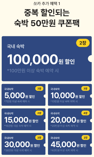 쏘카에서는 2024년 추석맞이 대한민국 숙박세일페스타 할인 쿠폰에 더해서 중복 할인되는 숙박 50만 원 쿠폰팩을 제공하는 추가 혜택이 있습니다. 쿠폰 발급받으시고 추가혜택도 이용해 보세요.