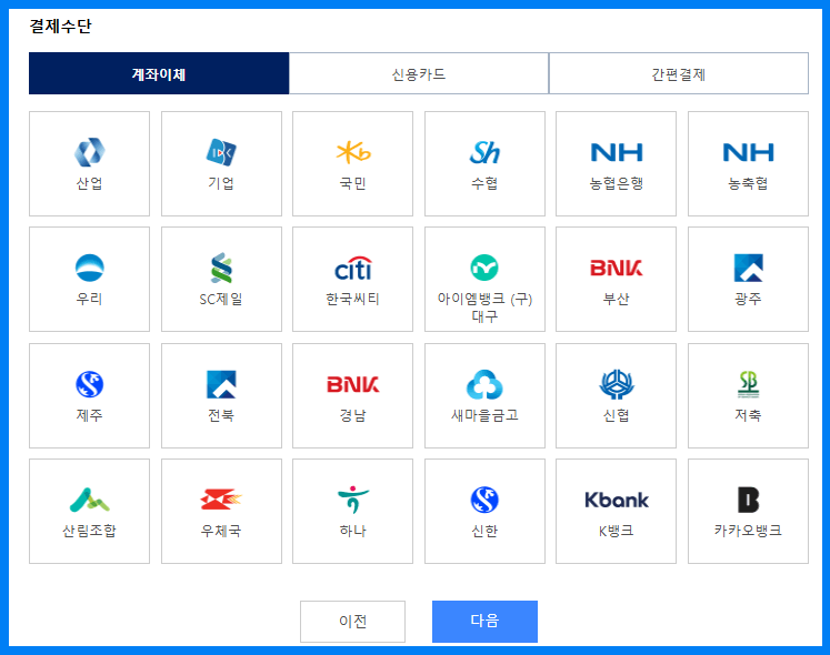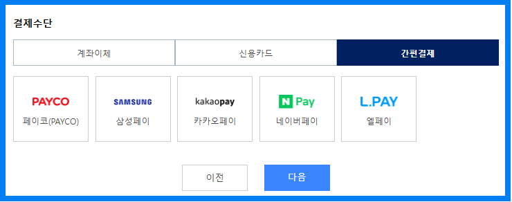 납부방법은 계좌이체, 신용카드, 간편 결제 모두 가능합니다. 현재 이벤트를 진행하고 있는 카드사는 아래버튼 통해서 확인하실 수 있어요.