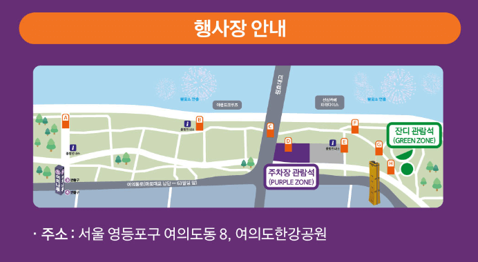 교통편을 미리 숙지하시고 축제에 참여하시면 더 즐겁게 불꽃축제를 경험하실 수 있을 것입니다. 이번 글에서는 행사장과 교통, 주차 관련해서 안내드리겠습니다.